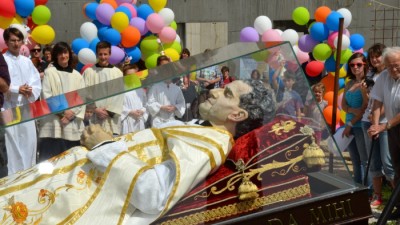 Mégis talán a legérdekesebb találkozásom az volt mikor, szintén a Bécsi úton sétáltam a járdán, mikor szembe jött velem egy üvegkoporsó benne egy életnagyságú viasz szoborral. Igen csak meglepődtem mikor zene hallgatás közben felnéztem és láttam amint az üvegkoporsó igen nagy sebességgel közelít felém. Teljesen egyedül. Kíséret nélkül gurult felém egy üvegkoporsó a Bécsi úton a járdán (legalább a közlekedési szabályokat tudja). Kicsit bepánikoltam. Kitudja? Lehet, hogy megbolondultam, gondoltam. Pláne amikor megláttam a feliratot a koporsó szélén: ” Don Bosco” . Szerencsére még mielőtt elcsapott volna a koporsó két nagydarab ember ugrott ki a templomkertből és kapta el az elszabadult szent koporsóját. Mondjuk ez még jobban hangzana a hírekben: ” Don Bosco koporsójával gázolt el egy nőt a járdán”